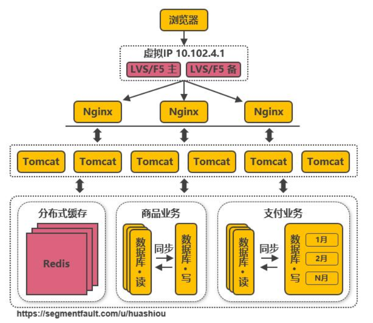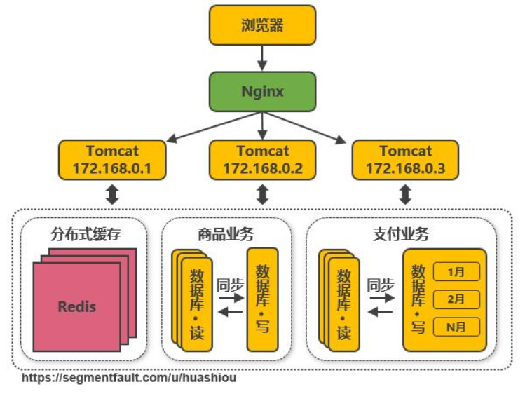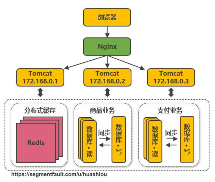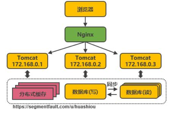 - 此处需要注意的是,上图中从Nginx层到Tomcat层这样画并不代表全部Nginx都转发请求到全部的Tomcat,在实际使用时,可能会是几个Nginx下面接一部分的Tomcat,这些Nginx之间通过keepalived实现高可用,其他的Nginx接另外的Tomcat,这样可接入的Tomcat数量就能成倍的增加。