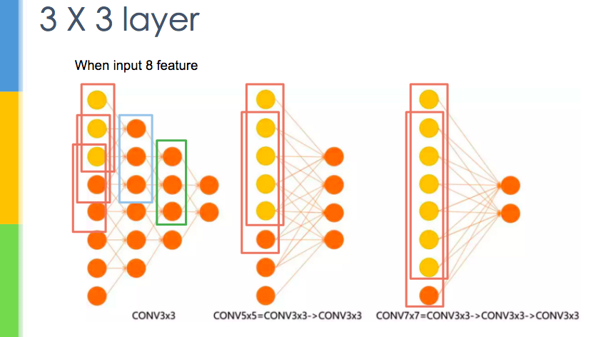 - 这里的等价时 2个3*3卷积核的感受野与1个5*5卷积核相同