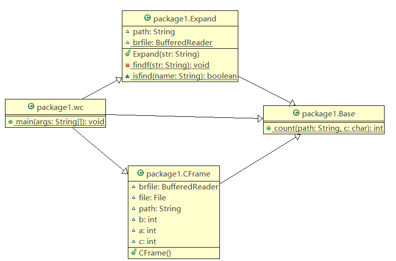 根据需求之间的联系,将此次项目分为四个类,分别是基本功能类(实现行,字符,单词的统计),扩展功能类(实现递归处理文件)高级功能类(GUI),以及主类。
