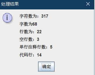 "字符数为:"+Base.count(path,'c')+"\n字数为"+Base.count(path, 'w')+"\n行数为:"+Base.count(path, 'l')+"\n空行数:"+Base.count(path, 'n')+"\n单行注释行数:"+Base.count(path, 'e')+"\n代码行:"+Base.count(path, 'o'),"处理结果",