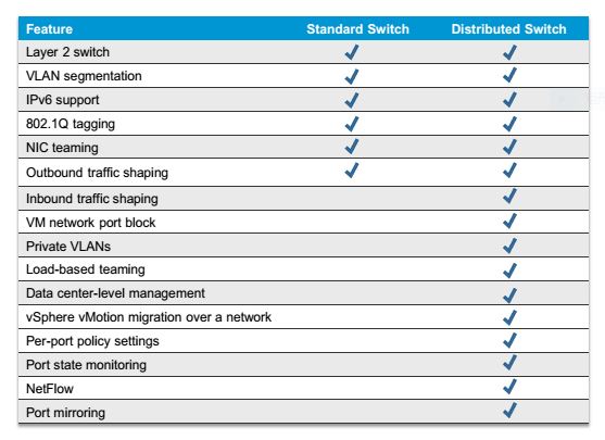 连通到同一个虚拟交换机的设备都获得了相互通信的通道。分布式虚拟交换机与标准虚拟交换的区别列表对比如下:
