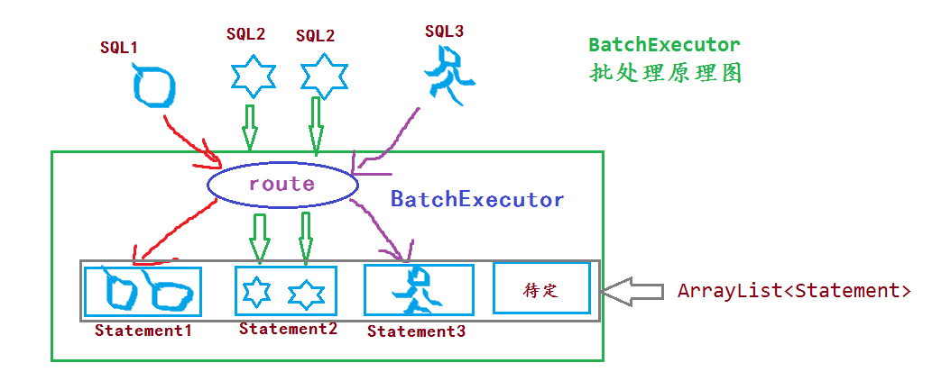 BatchExecutor的批处理,和JDBC的批处理,主要区别就是BatchExecutor维护了一组Statement批处理对象,它有自动路由功能,SQL1、SQL2、SQL3代表不同的SQL。(Statement或Preparestatement)