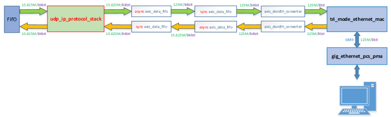 例程的原理如下图所示。2个例程均实现了UDP收发环路,即在电脑上通过网络调试助手向开发板发送任意长度小于1472字节的UDP包。开发板接收到udp包经过fifo缓存后重新发回电脑,由此验证数据收发的正确性。