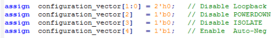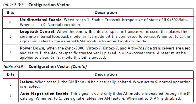 Configuration_Vector用于配置IP核的基本工作模式,可替代MDIO接口的功能。其具体含义如下图所示。