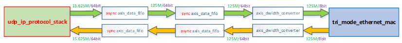 由于1G速率下Tri Mode Ethernet MAC的AXI-Stream数据接口同步时钟信号为125MHz。此时,UDP IP协议栈64bit的AXI-Stream数据接口同步时钟信号应该为125MHz/(64/8)=15.625MHz。因此,异步AXI-Stream DATA FIFO两端的时钟分别为125MHz(8bit),15.625MHz(64bit)。