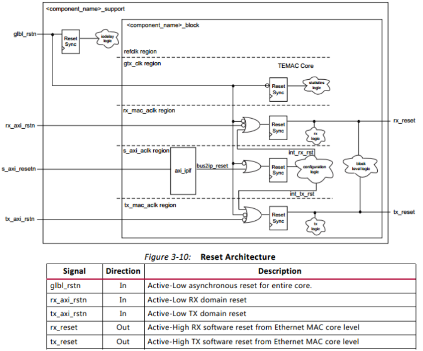 其中glbl_rstn为全局复位信号,用于复位整个IP核。rx_axi_rstn和tx_axi_rstn分别用于单独复位接收和发送部分的逻辑,一般无需使用。在例程中,将rx_axi_rstn和tx_axi_rstn都被恒置为1。