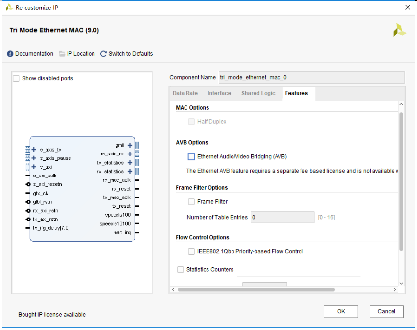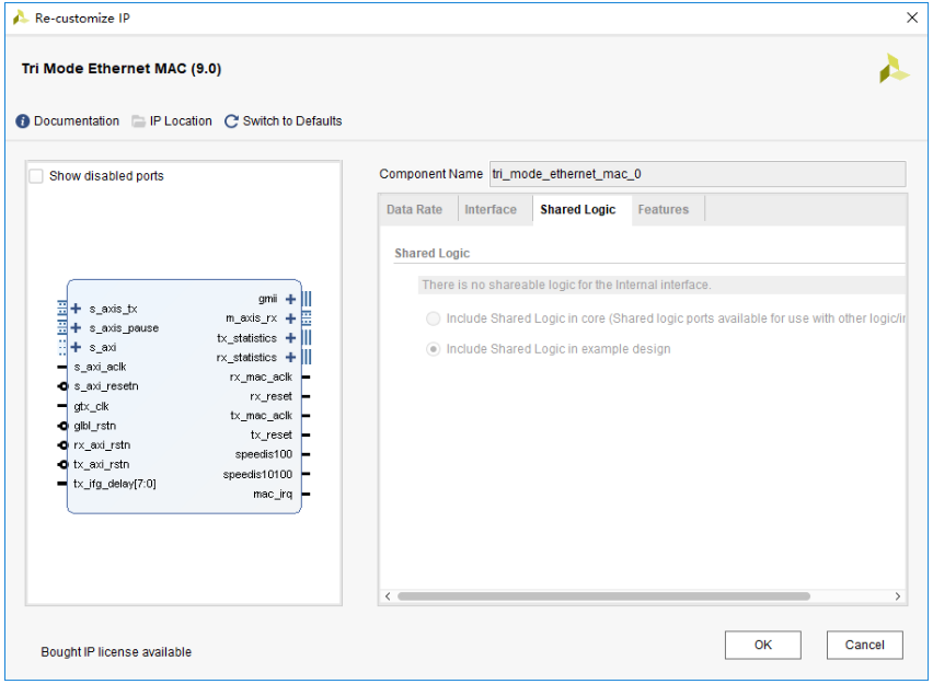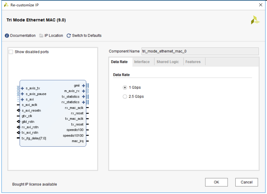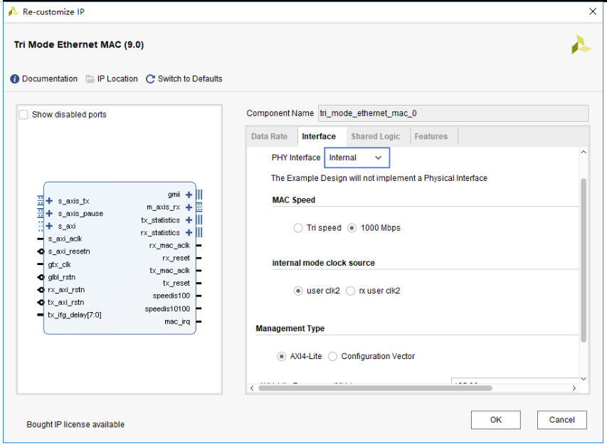 首先,由于该IP需要与IP核1G/2.5G Ethernet PCS/PMA or SGMII之间通过GMII接口连接,此时不需要在IP核内部为GMII接口添加I/O BUF。因此,需要将PHY Interface设为Internal。