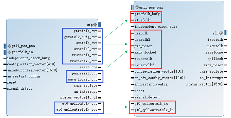 在设计中,需要将Tri Mode Ethernet MAC与1G/2.5G Ethernet PCS/PMA or SGMII之间通过GMII接口互联。Tri Mode Ethernet MAC IP核的工作时钟源为1G/2.5G Ethernet PCS/PMA or SGMII输出的userclk2,频率为125MHz。同时,userclk2也与GMII接口的各信号同步。GMII接口连接如下图所示。由于本例程中不使用MDIO接口,无需连接。