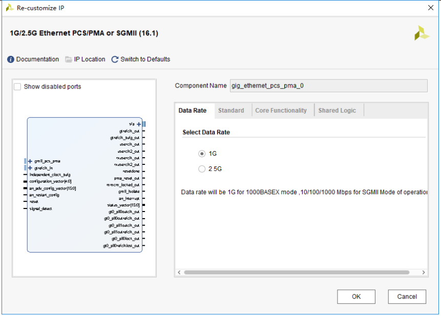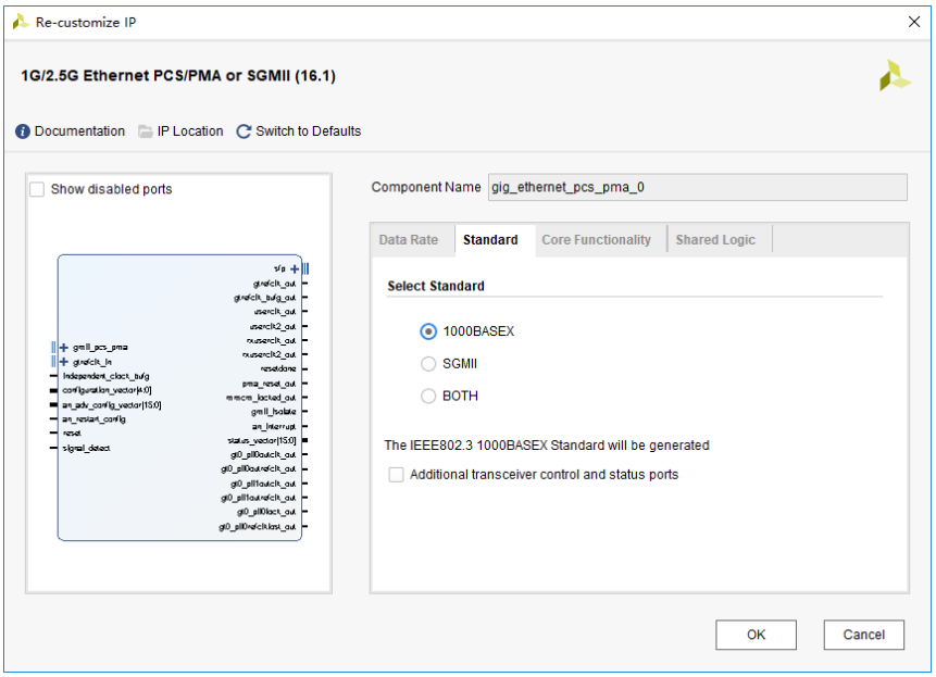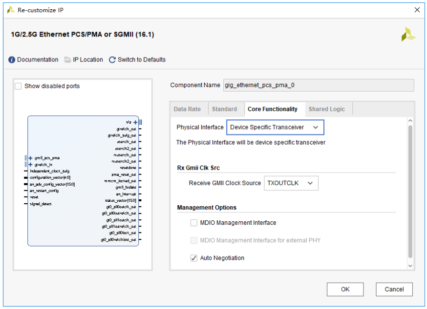 在设计中不使用MDIO与1G/2.5G Ethernet PCS/PMA or SGMII IP核连接,因此不使能MDIO接口。