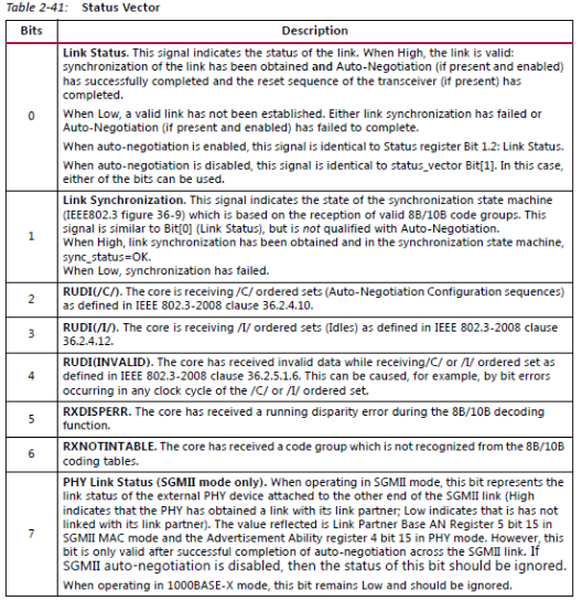 Status_Vector反应了IP核工作状态,其具体含义如下图所示。可以把其中的若干个信号接至LED灯上进行观察。其中比较重要的几个信号分别为bit0、bit1、bit12。