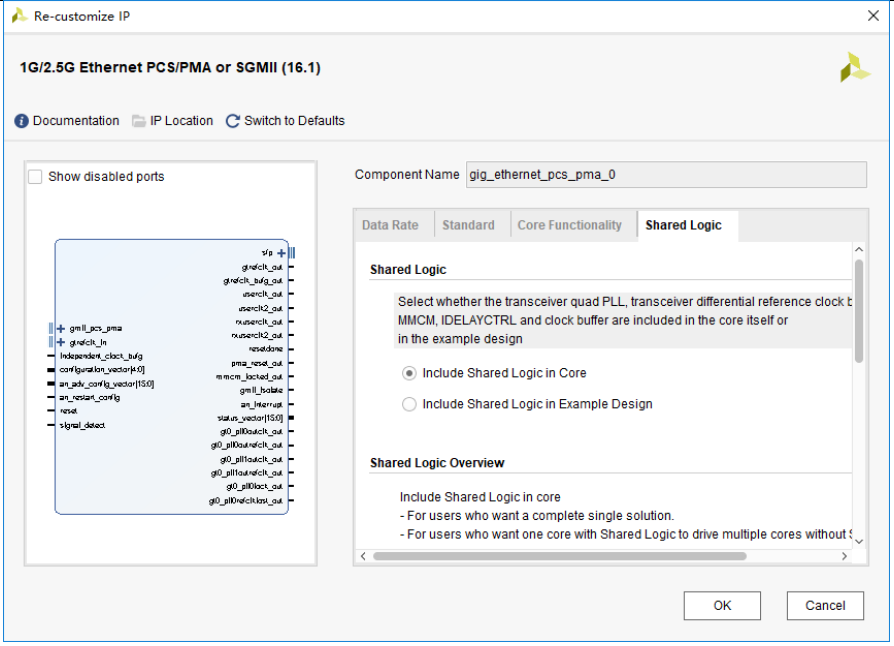 上图中,左侧的IP核选择了将共享资源包含在IP核内部,右侧的IP核则选择了将共享资源从IP核内部去除,移至example desgin中。在udp_ip_1g_sfp_2ch例程中,例化了2个IP核。其中,gig_ethernet_pcs_pma_i_1对应上图左侧的IP核,pcs_pma_i_2对应上图右侧的IP核。这取决于上面所提到的1个IP设置,其中pcs_pma_ i_1的设置如下图所示。