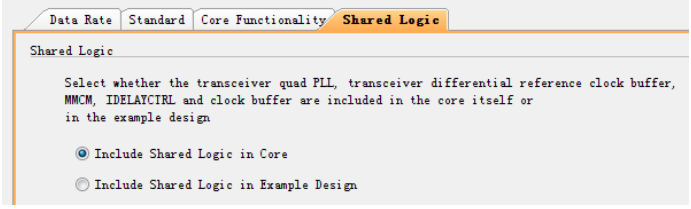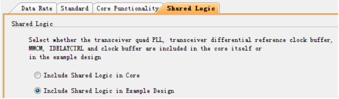 当设计中需要同时使用若干个此IP核,且所使用的GTX均位于同一个GTX BANK中。此时,只需其中1个IP核内部的共享资源(MMCM、GTX PLL、GTX 参考时钟等)便可以满足所有IP核的需求,即选择将共享资源包含在IP核内部。其余IP核将这些共享资源从其内部剔除即可,即选择将共享资源包含在example中。