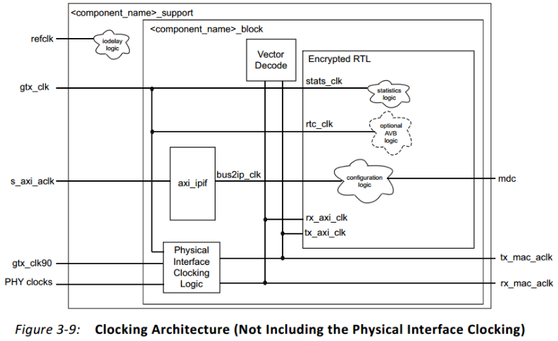 IP核内部时钟网络结构如下图所示。其中,tx_mac_aclk为AXI-Stream发送接口的同步时钟,rx_mac_aclk为AXI-Stream接收接口的同步时钟。由于在设计中没有使用MDIO接口,所以不存在时钟信号mdc。