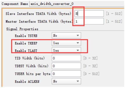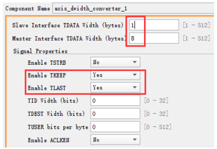 在发送路径中,进行64bit到8bit的转换,AXI4-Stream Data Width Converter设置如下图所示。