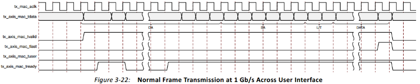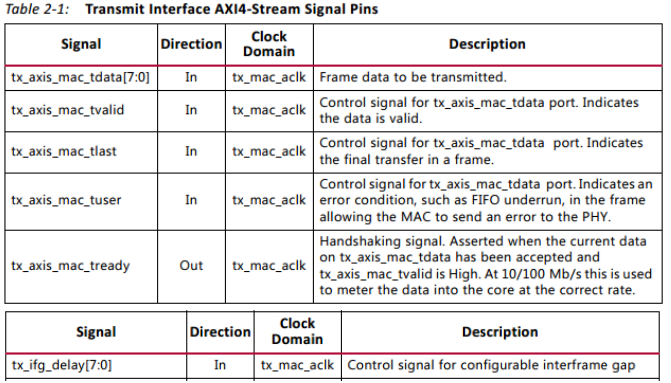 AXI-Stream发送接口信号如下图所示。用户通过该接口,向IP核传输所需要发送的以太网数据包。其中,tx_ifg_delay用于设置发送间隔,一般都默认采用最小间隔,将tx_ifg_delay置为0即可。