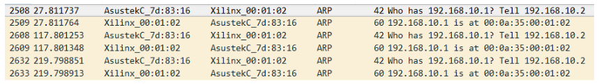 在整个测试过程中,电脑会以一定频率持续向开发板发送ARP请求,开发板均能及时响应,wireshark软件抓取的电脑与开发板的ARP通信过程如下图所示。