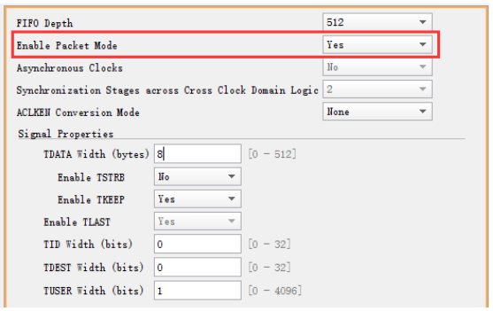 Packet mode是指FIFO在输出数据前持续缓存AXI-Stream接口输入的数据直至输入端tlast信号拉高,即存满一个完整的数据包时,才开始在AXI-Stream输出端口向外输出数据。Packet mode功能设置如下图所示。需要注意的是,启用Packet mode时,FIFO必须工作于同步模式。