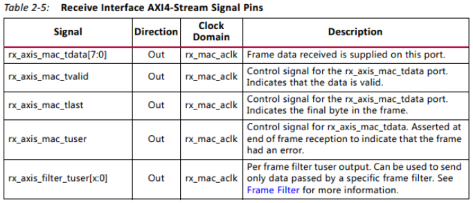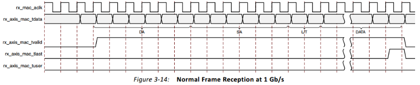 AXI-Stream接收接口信号如下图所示。用户通过该接口接收从IP核输出的以太网数据包。需要注意的是,接收接口没有使用AXI-Stream标准中的tready信号。这代表接收端需要具备持续接收数据的能力,防止出现数据来不及接收而产生溢出。