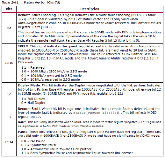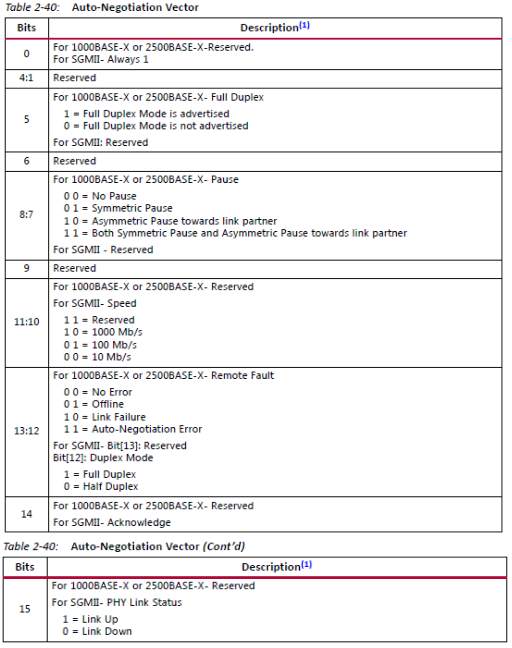 an_adv_config_vector用于配置IP核的自协商功能,其具体含义如下图所示。对于1000BASEX模式,只需要关注bit5,bit8~7,bit13~12。