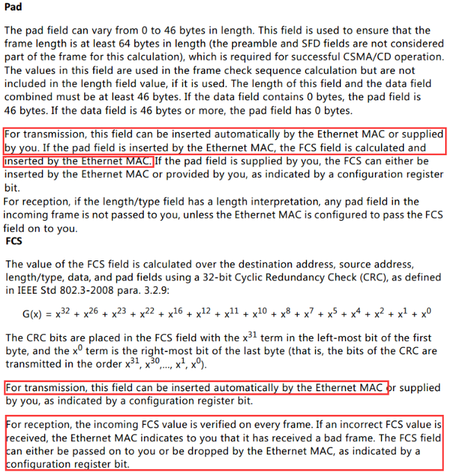 Tri Mode Ethernet MAC IP核在默认情况下,发送帧长度小于64字节时,IP核会在帧末尾自动补0,补足至64字节,并且再帧末尾自动插入4字节CRC。接收时,IP核自动去除末尾4字节CRC,但对于长度小于64字节的帧末尾补的0不会被去掉,仍会通过接收接口输出。因此,可以发送的数据长度在14~1514(含14字节MAC帧头)字节之间。