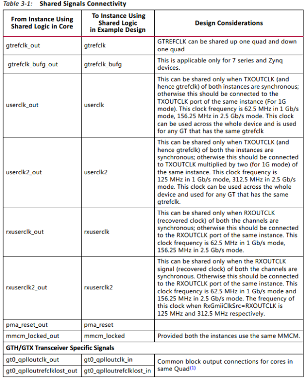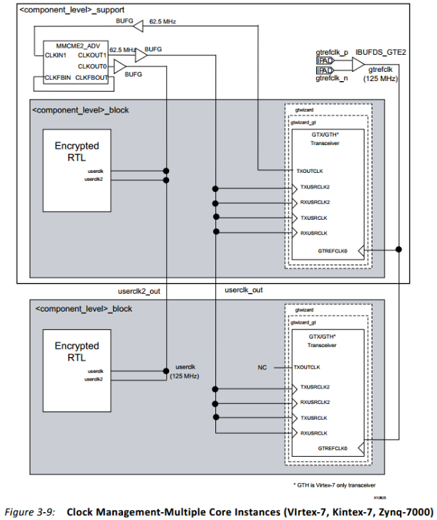 当需要使用多个IP时,且所使用的GTX位于同一个GTXBANK中时,不同IP核之间的时钟网络可以进行共享,如下图所示。多个IP核可共享同1个GTX BANK的参考时钟,以及同一个MMCM输出的时钟信号。