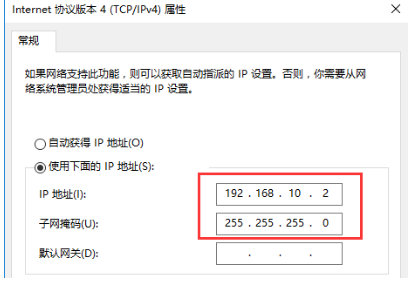 测试前,需要将所使用电脑网卡的IP地址设置为192.168.10.2,子网掩码设为255.255.255.0,如下图所示。