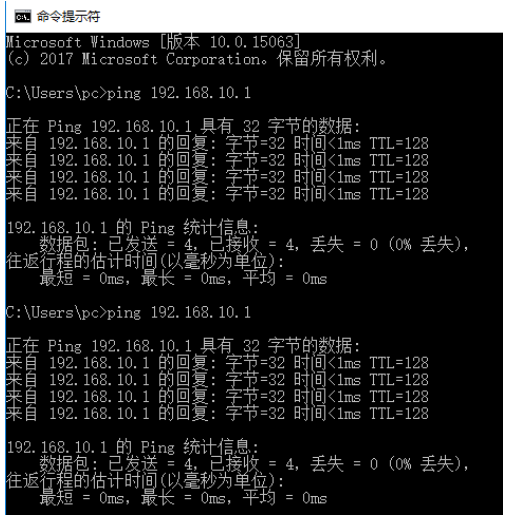 在网络调试助手向开发板发UDP包的同时,通过cmd命令窗不断向开发板发起ping命令,观察ping命令的返回,如下图所示。从图中可以看到开发板能够快速响应电脑发起的ping命令,UDP数据包收发与ping应答互不干扰。