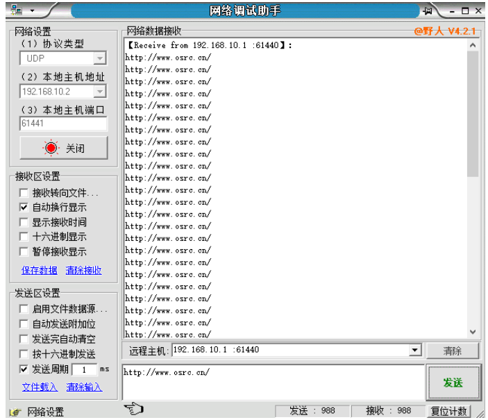测试结果上图所示。从图中可以看出,网络调试助手所发出的udp包和开发板返回的udp包一致,接收和发送的数据包数量一致。