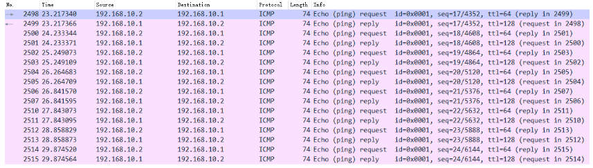 通过wireshark软件对ping过程的数据进行抓包验证,如下图所示。