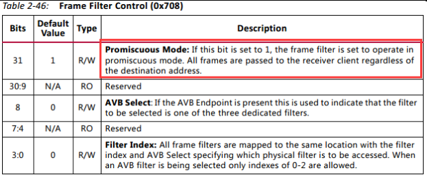 最后一个步骤启用IP核的promiscuous mode,关闭了接收帧过滤功能,使IP核接收包含任何目的MAC地址的以太网帧。如果用户需要考虑进行MAC地址过滤可关闭该功能。相关寄存器如下图所示。