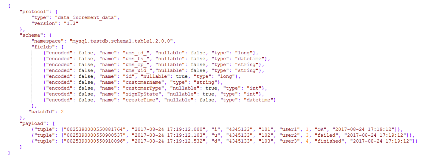 无论是增量、全量还是日志,最终输出到结果kafka中的消息都是我们约定的统一消息格式,称为UMS(unified message schema)格式。如下图所示: