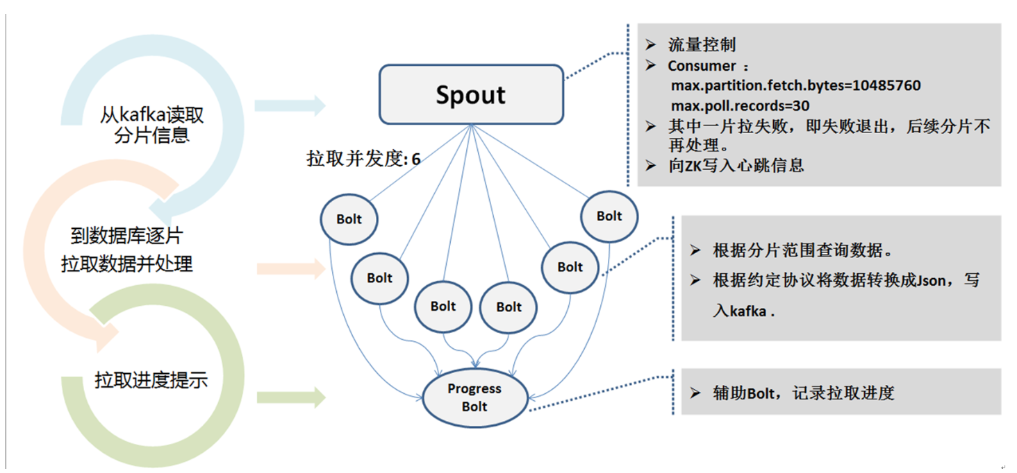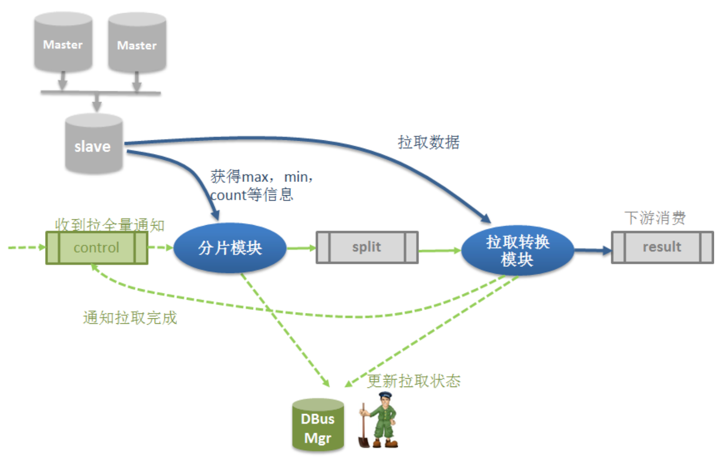 每个分片代表一个小任务,由拉取转换模块通过多个并发度到方式连接slave从库拉取,完成情况汇报到zk中,便于监控。