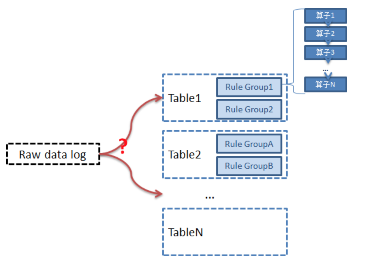 每个表是一个规则 算子组的合集,可以配置1个到多个规则算子组 每个规则算子组,由一组规则算子组合而成 拿到一条原始数据日志, 它最终应该属于哪张表呢?