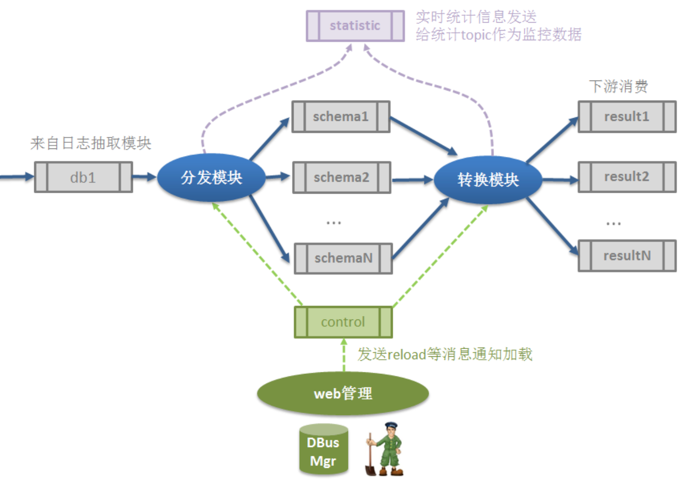 - 监控数据,分发模块和转换模块都会响应event,统计每一张表在两次心跳中的数据和延迟情况,发到统计系统进行监控数据