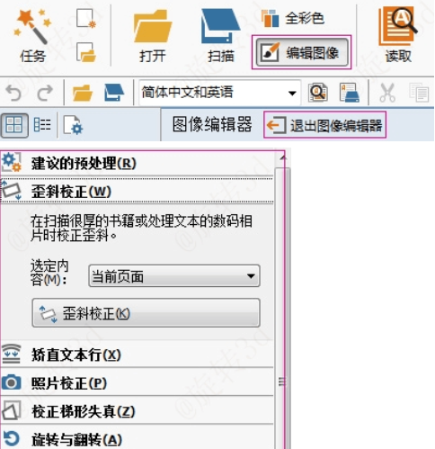 7、“主工具栏”上的“编辑图像”是用来处理图像的,扫描或拍照有倾斜、对比度不好、变形等问题,先对图像修正以提高识别率,调整完以后点击“退出图像编辑器”就可以回到主界面。