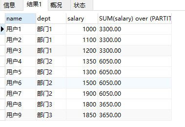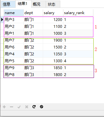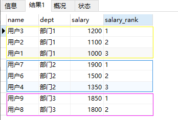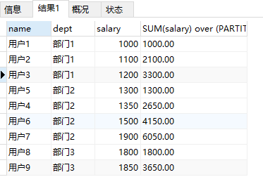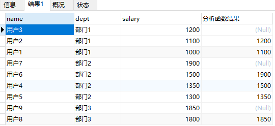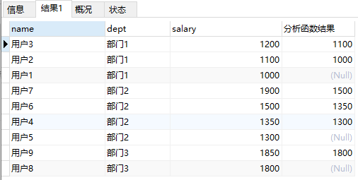 lead (salary, 1) over (PARTITION BY `dept` ORDER BY salary DESC) '分析函数结果'