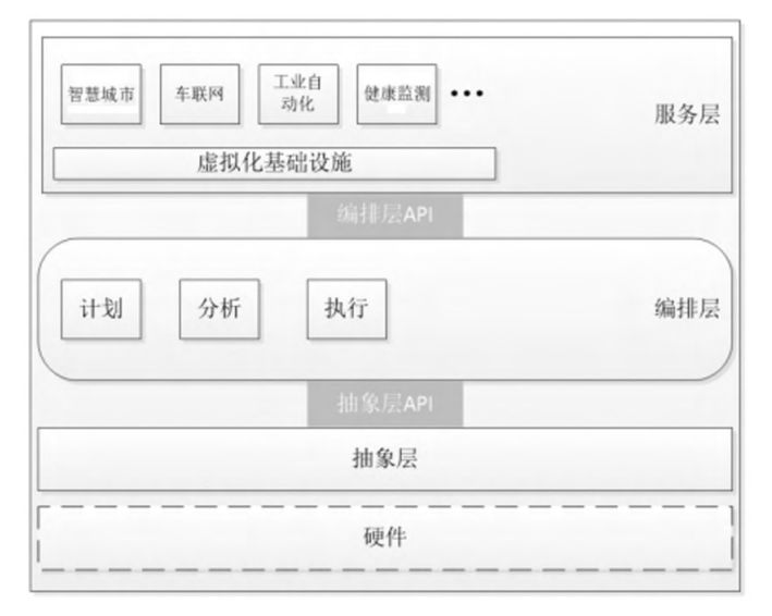 如图 3 所示,雾计算软件栈分为三层:抽象层、编排层、服务层。抽象层向上层输出标准的抽象层 API,隐藏不同设备的异构性,降低应用开发难度。编排层利用抽象层 API 构建雾计算资源池,提供虚拟化基础设施,接收服务层的资源请求。服务层是虚拟机实例,用户请求的服务均在虚拟机中运行,兼容用户的可执行环境。