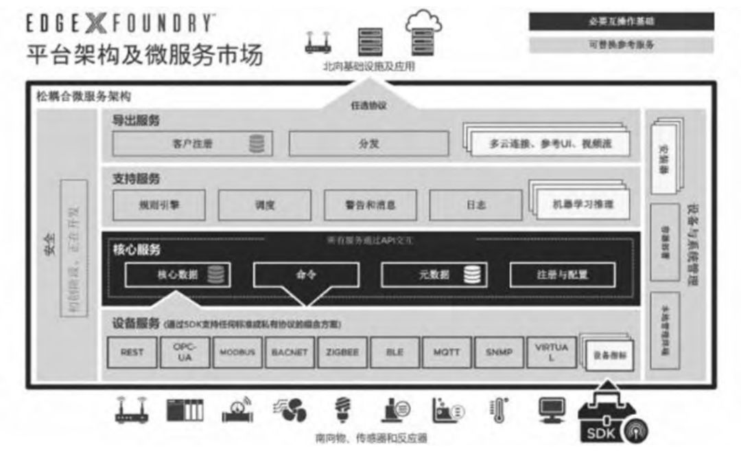EdgeX Foundry 是一个由 Linux 基金会主持的开源项目[7],其目的是为边缘计算的开发构建一个通用开放的平台,已获得 Dell、百度、Intel 等 50 余家企业的支持,EdgeX Foundry 兼容多种操作系统,支持多种硬件架构,支持不同协议设备间的通信。如图 4 所示,EdgeX Foundry 基于微服务架构设计有效提高应用与服务开发效率,其微服务被划分为四个服务层和两个基础系统服务,EdgeX Foundry 的四个服务层包含核心服务层、支持服务层、导出服务层和设备服务层;系统服务包含安全服务和管理服务。基于微服务可裁剪特性,从而实现在低性能设备运行 EdgeX Foundry 服务。因此,EdgeX Foundry 支持嵌入式 PC,集线器,网关,路由器和本地服务器等异构设备。EdgeX Foundry 支持容器化部署,有效提高了平台运行效率。