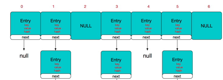 数组里存的是Entry对象,当出现冲突的时候结点的next指针指向冲突的结点。