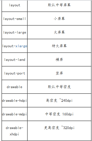 关于系统的资源配置的目录(Android系统支持多配置资源文件,我们可以追加新的资源目录到你的Android项目中。命名规范:资源名字-限制符