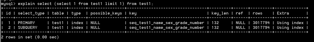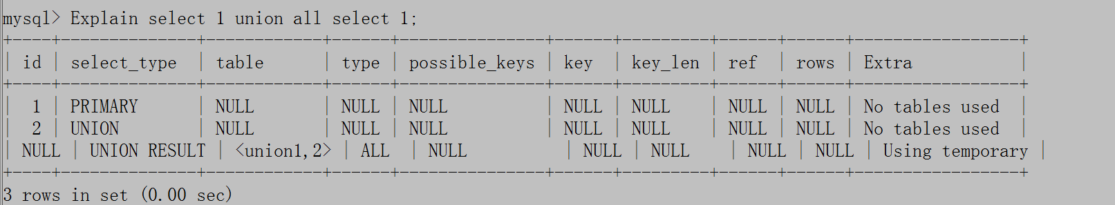 union:在union中的第二个和随后的select被标记为union。第一个select被标记就好像它以部分外查询来执行。这就是之前的例子中的union中的第一个select显示为primary的原因。如果union被from字句中的子查询包含,那么它的第一个select会标记为derived;