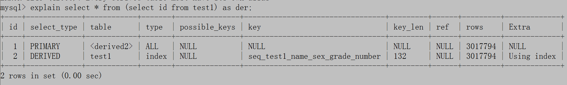 这个查询语句执行时有一个匿名临时表。MySQL内部通过别名(der)在外层查询中引用这个临时表,在更复杂的查询中可以看到ref列。