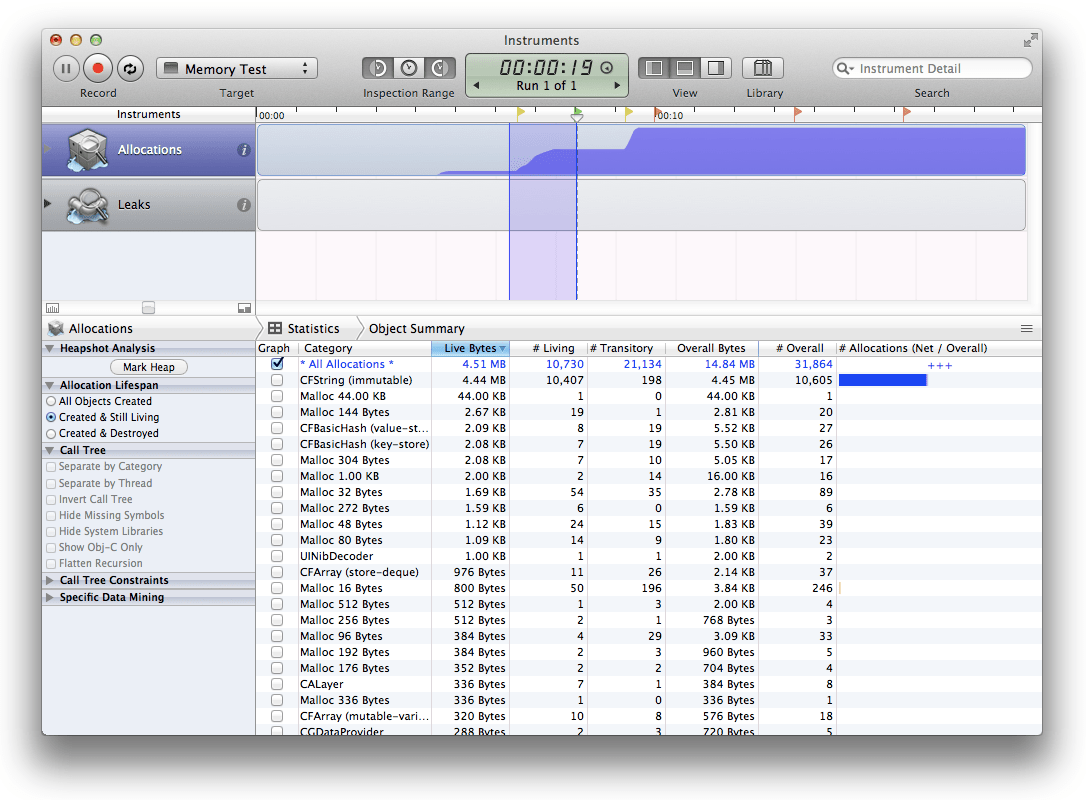That can be helpful, but sometimes it's just cryptic CFString or CGImage allocations. It's therefore sometimes useful to see where in your code those objects were allocated. If you switch from "Statistics" - "Object Summary" to "Call tree", it will now show you how much memory was taken up by each of your methods (and I find this screen most useful if I also check "Invert Call Tree" and "Hide System Libraries"):