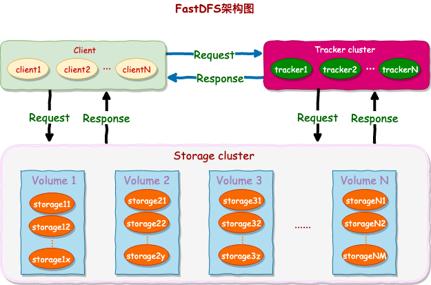 工作方式:客户端向 tracker 发出请求,然后 tracker 从 storage 节点拿到源数据,返还给客户端,然后客户端根据源数据再去请求 storage 节点。