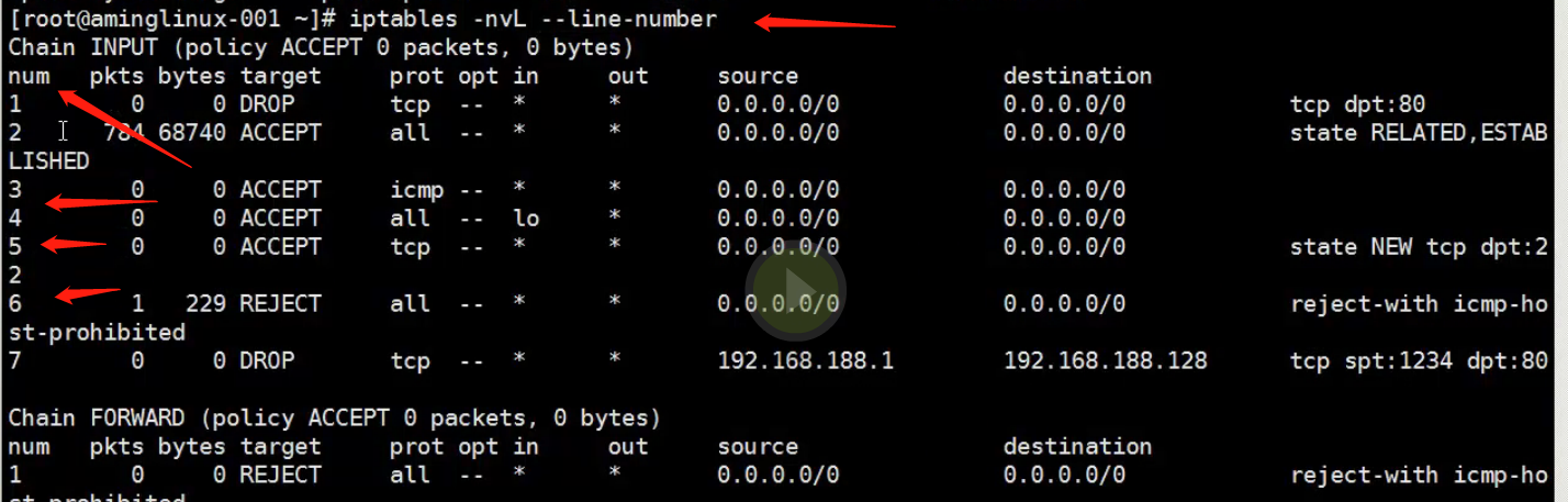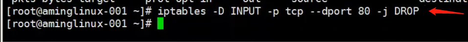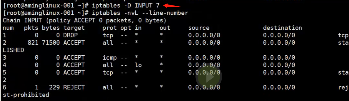 - 然后使用命令 iptables -D INPUT + 规则编号 就可以删除相应编号的规则