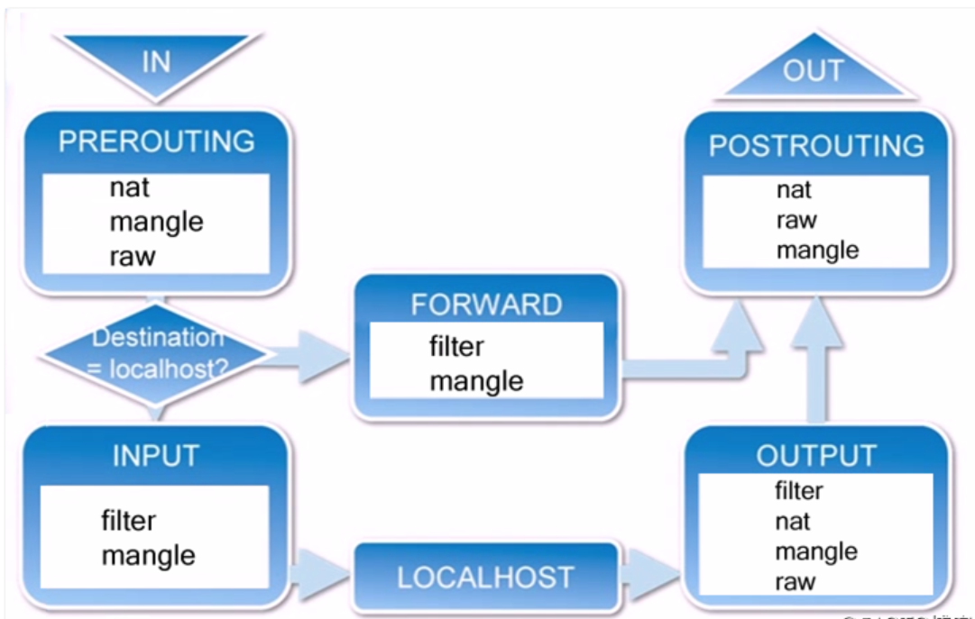 - 比如说,prerouting 里面有三个表,nat,mangle,raw