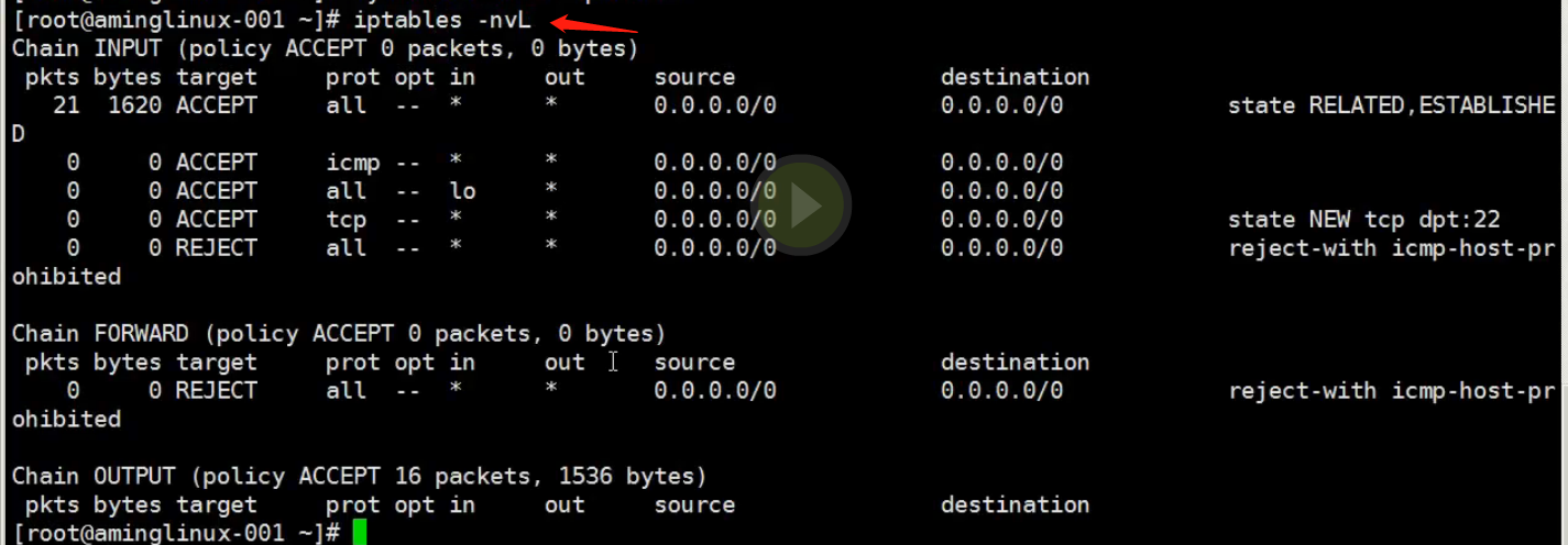 - 如图,使用命令 iptables -nvL 可以查看 iptables 的默认规则信息