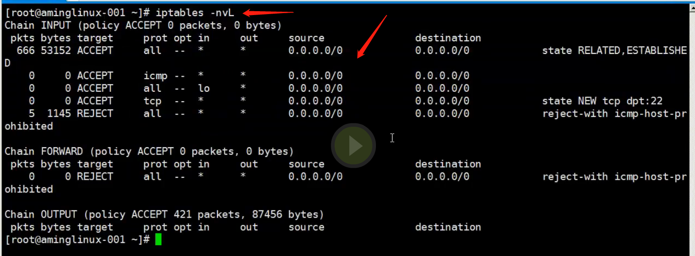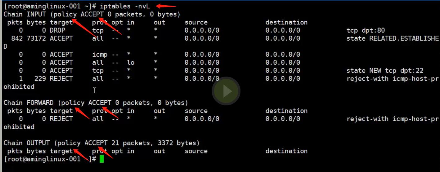 - 比如这里,默认策略是 ACCEPT ,如果没有设置规则的话,数据包都是直接通过的