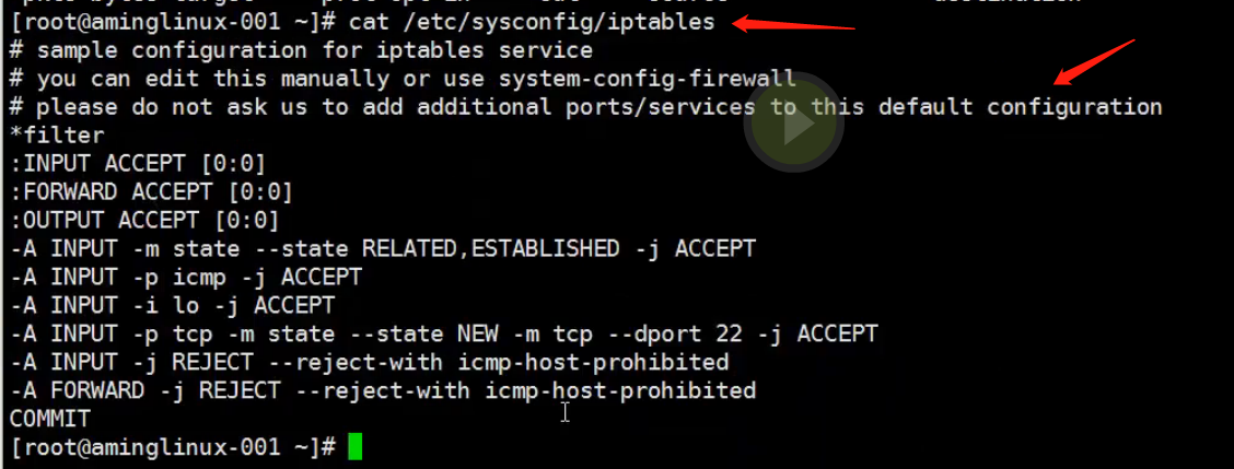 - 上图是 cat 默认规则的配置文件,/etc/sysconfig/iptables 就是规则的配置文件