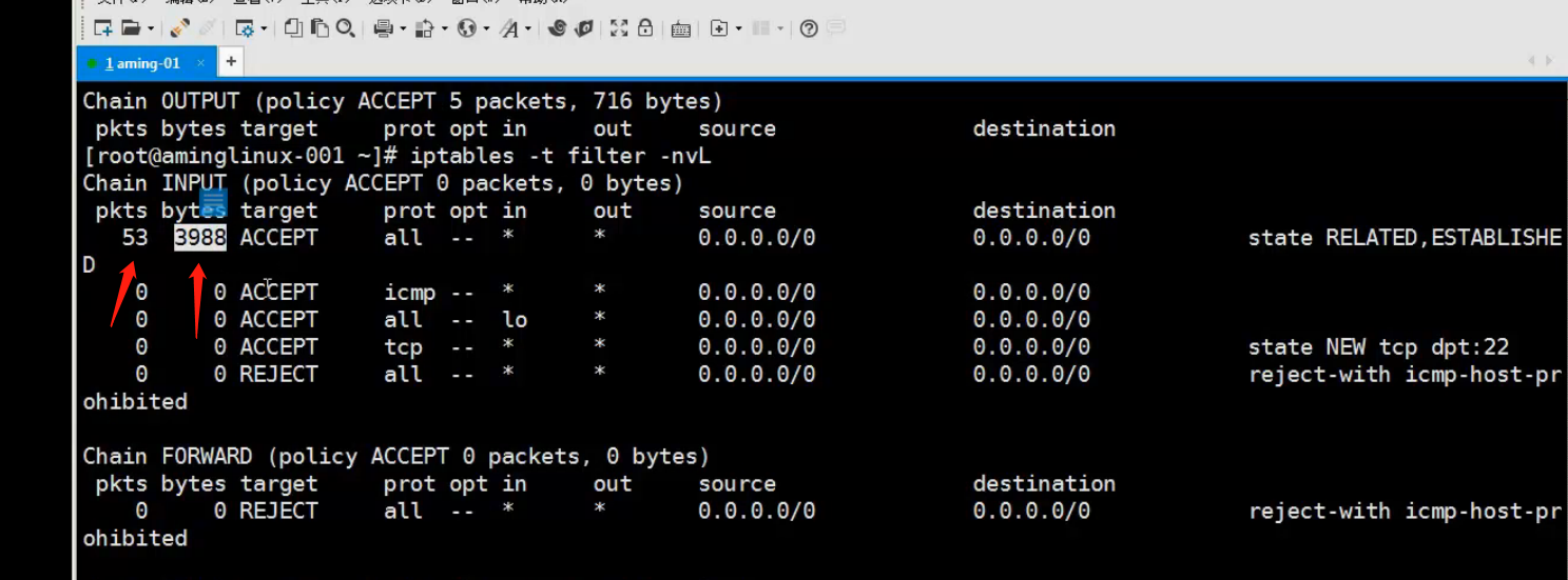- 如图,查看filter规则,可以看到,input链的规则已经变成脚本设置的规则了